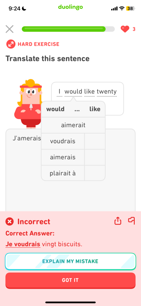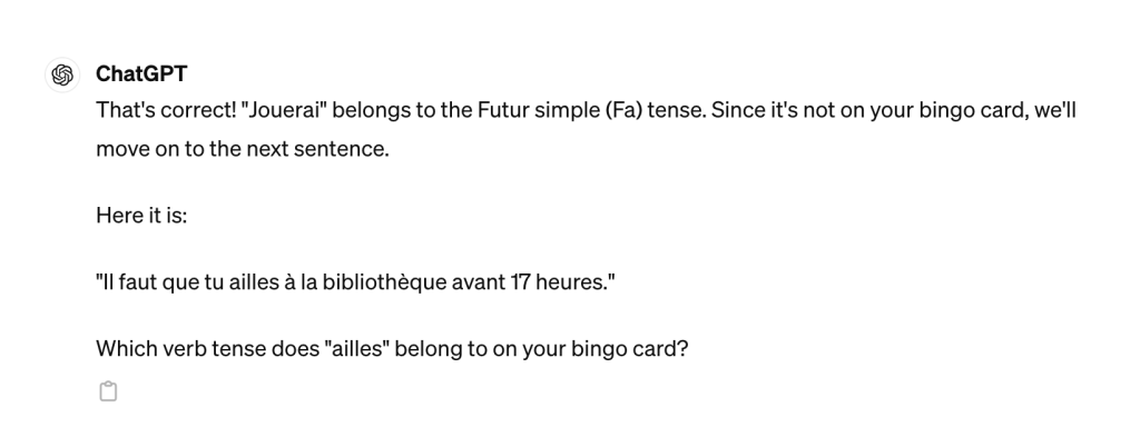 I have also been using ChatGPT to learn French. When using a tool like ChatGPT, it is essential to be mindful of wording your prompt (J.White, personal communication, April 12, 2024). My first time using the tool, I wanted a refresher on conjugating verbs to the proper tenses but in a more engaging way. After a few prompts, I decided to try a bingo game; ChatGPT would give me a conjugated verb, and I would have to write the tense in which it is. While the game was simple enough, I did catch some errors, such as inputting the wrong tense, but the program told me the answer was correct. While Huang and Li (2023) mentioned that using this tool can weaken people’s abilities to self-correct, I used it to double-check my answer with a verb conjugation website: https://leconjugueur.lefigaro.fr/. Thus, while using ChatGPT is not perfect, it allows me to check my work, and then I can correct the program by letting it know my answer was incorrect. A positive thing about using this tool is that I immediately get instant feedback and explanations, which I do not do with Duolingo.